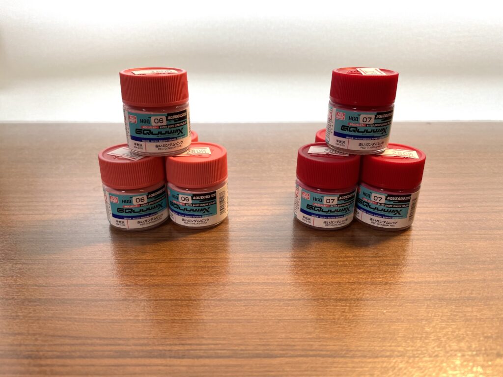 塗装関係・・・水性ガンダムカラー:HGQ06 赤いガンダムピンク、HGQ07 赤いガンダムレッド(※今月発売の新商品です)、ガンダムマーカー:ジオン軍セット