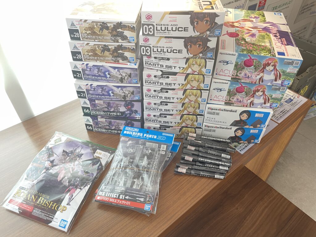 プラモデルその他・・・ビルダーズパーツ: 1/100 MSエフェクト01、Figure-rise Standard:ラクス・クライン、ニカ・ナナウラ、30MM:アチェルビー(TYPE-E)、オプションパーツセット10(大型プロペラントタンクユニット)、 オプションパーツセット15 (マルチバーニア/マルチジョイント)、30MS:ルルチェ[カラーC]、オプションパーツセット17(エイダーコスチューム)[カラーA]、30MF:クラスアップアーマー(ローザンビショップ)