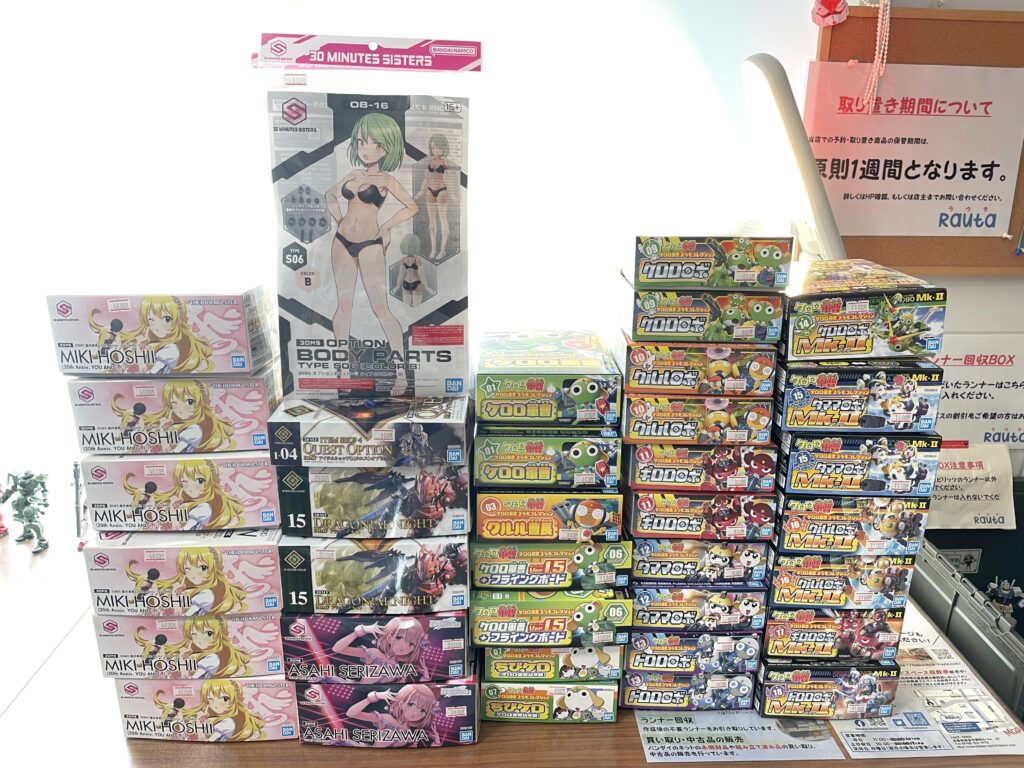 プラモデルその他・・・オプションパーツセット ガンプラ:03(ビルドハンズ 角型)、 09 (ジャイアントガトリング)、12(大型レールガン)、17(バインダーガン)、Figure-rise Standard:ニャアン、30MS:芹沢あさひ、星井美希(20th Anniv.YOU AND アイ!)、オプションボディパーツタイプS06[カラーB]、30MF:ドラゴニアナイト、アイテムショップ4(クエストオプション)、ケロロ軍曹:ケロロ軍曹、クルル曹長、ちびケロ、ケロロ軍曹Ver.1.5+フライングボード、ケロロロボ、クルルロボ、ギロロロボ、タママロボ、ドロロロボ、ケロロロボMK2、タママロボMK2、クルルロボMK2、ギロロロボMK2、ドロロロボMK2
