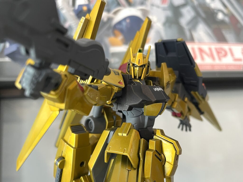 ガンダムビルドファイターズトライに登場する百万式(メガシキ)を、機動戦士Zガンダムのクワトロ・バジーナが搭乗する機体「百式」のように金ピカに塗装して仕上げらています>_<